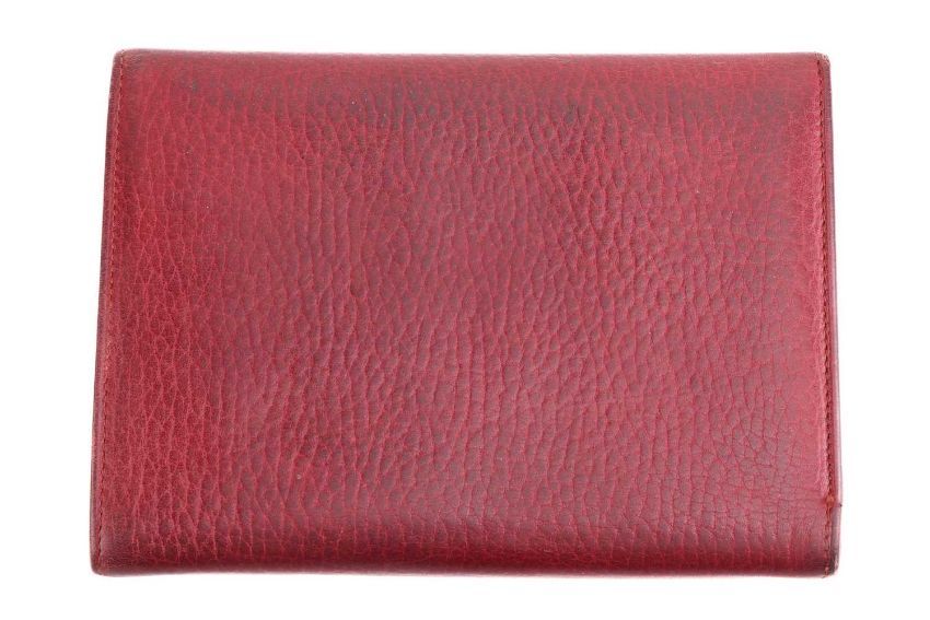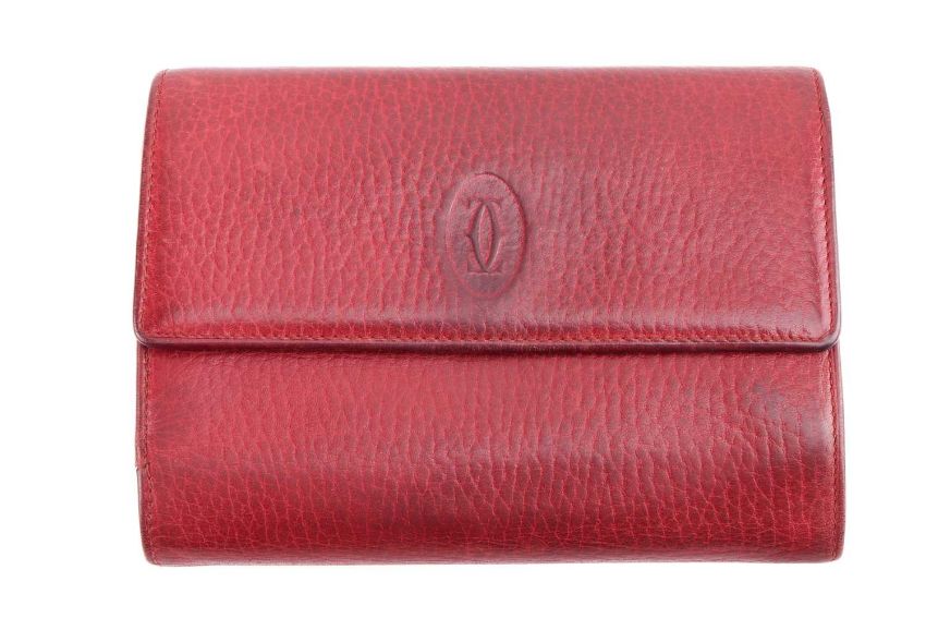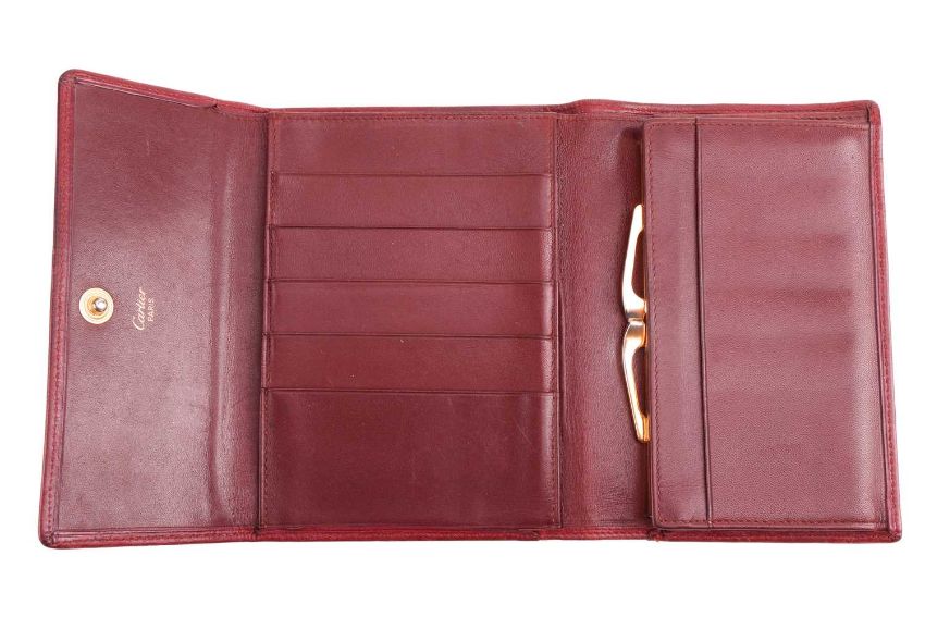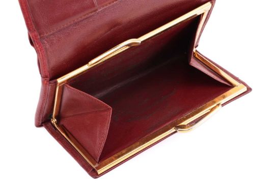 Cartier - a tri-fold wallet in burgundy leather, with card compartments and a kiss lock pouch for coins, signed, 14.3 x 11.0 cm.