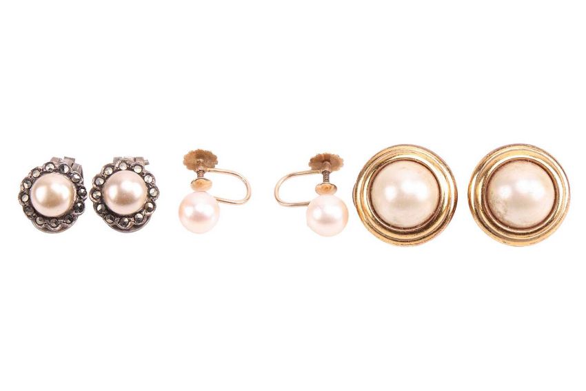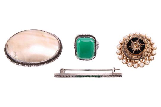 A mixed collection of jewellery including a string of round cultured pearl necklace with box clasp, an imitation pearl necklace, two gem-set brooches, two pairs of imitation pearl clip-on earrings, a gem-set bar brooch in millgrained mount, a pair of cultured pearl earrings in fittings marked '9ct', a tiger's eye ID bracelet in silver, an agate dress ring and a Mexican inlay bracelet.