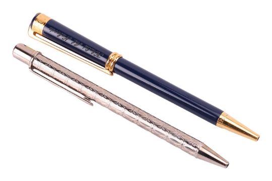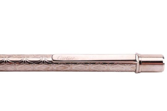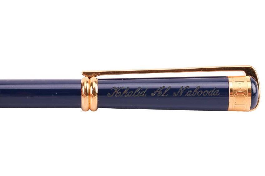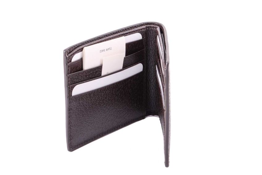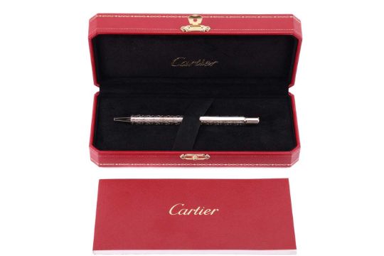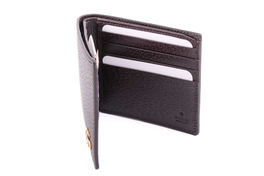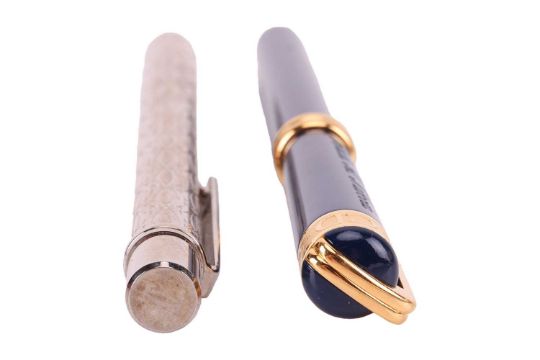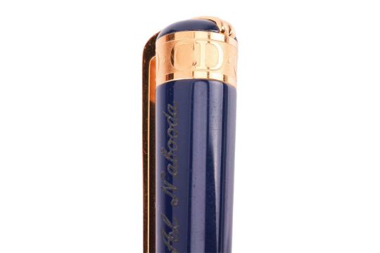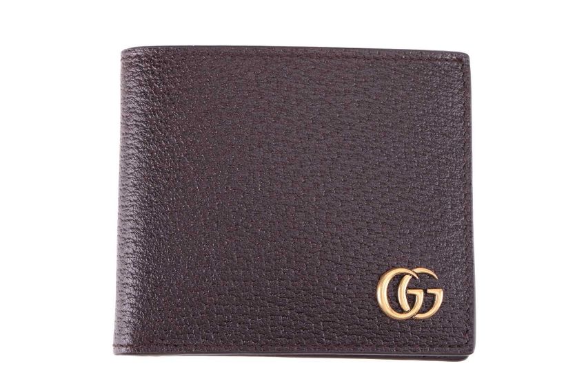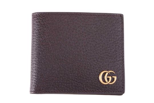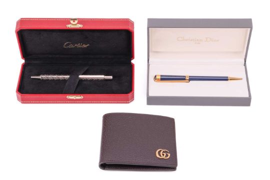A cased Christian Dior ballpoint pen with navy blue barrel and engraved with name; a cased Cartier ballpoint pen with C de Cartier motif, together with a guarantee certificate; and a Gucci bi-fold wallet in dark brown leather, with paperwork and pouch. (3)