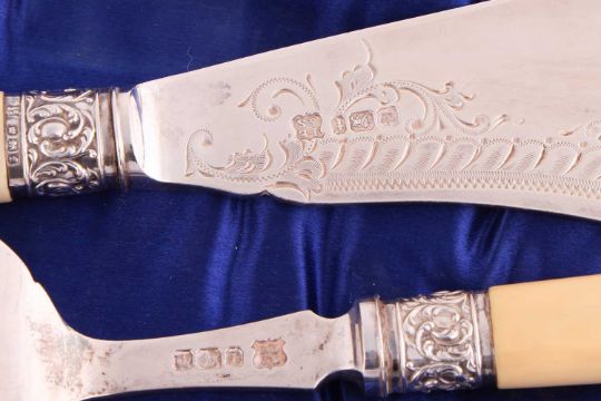 A quantity of mixed cased flatware, including a pair of Edwardian seal top serving spoons, Sheffield 1909 by C.W. Fletcher and Sons; a pair of Victorian composition-handled silver fish servers Sheffield1898 by Issac Ellis and Sons, three sets of teaspoons, (one with a replacement spoon), three various Christening sets and a cased shoe horn and button hook. 13.6 ozt weighable.
