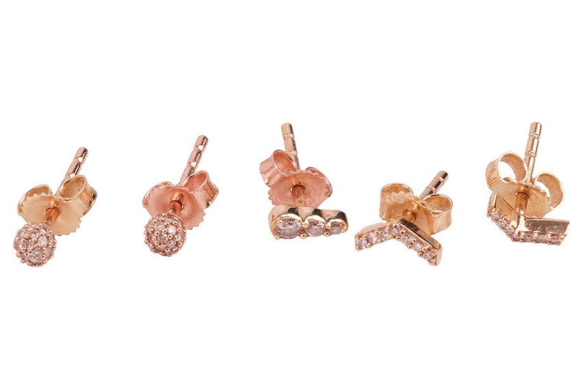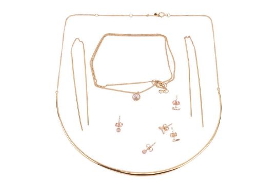 A collection of jewellery items; including a curved bar necklace, to a trace chain marked '10K'; a pair of bar drop earrings, marked '750'; a gold-plated gem-set pendant, marked '925'; two pairs of 14ct gold diamond-set stud earrings and one 14ct gold diamond-set stud earring; 14.7 grams (6)