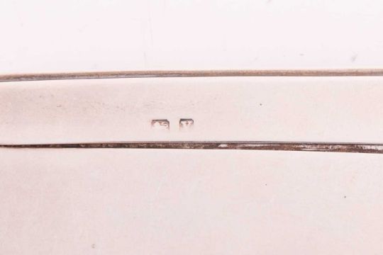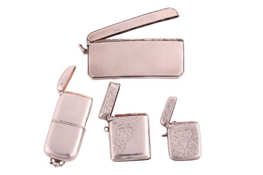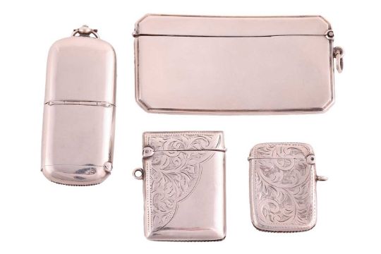 A silver card case of elongated octagonal form, slightly curved profile to fit in waistcoat pocket, 8.8 x 4.5 cm; a silver combination sovereign and vesta case, engraved with monogram; and two other vesta cases chased with scrollwork decorations; total weight of items 4.14 ozt. (4)