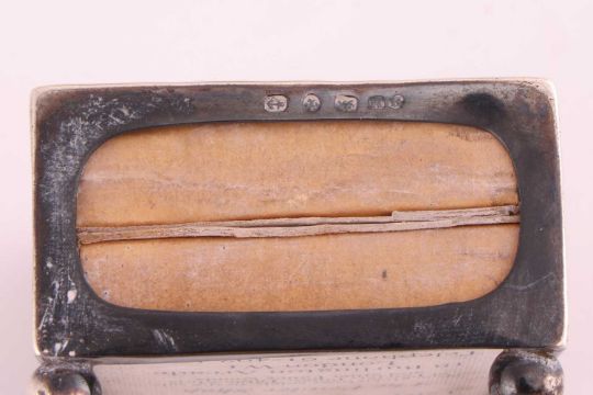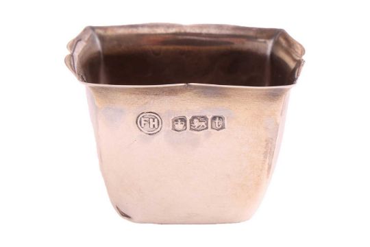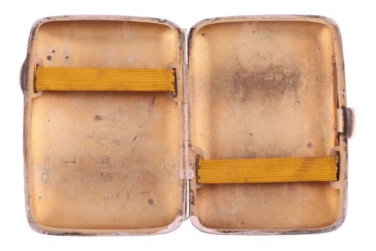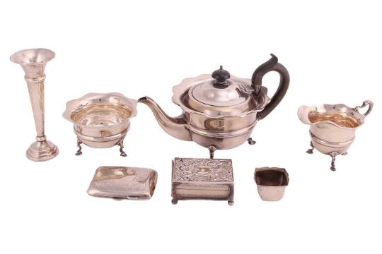 A group lot of silver items, comprising a silver three piece tea set, the teapot with ebonised knop and handle on three splayed feet, a silver trumpet shaped spill vase with weighted base, a silver cigarette, a silver matchbox cover and a miniature silver pot, 19ozt excluding the spill vase, (7).