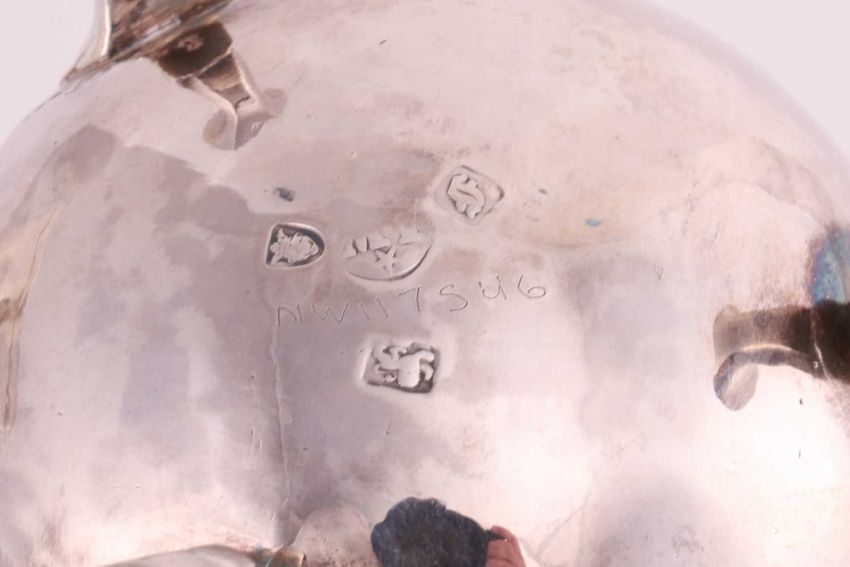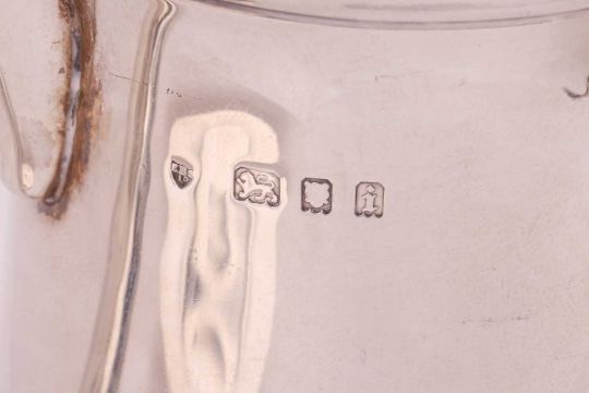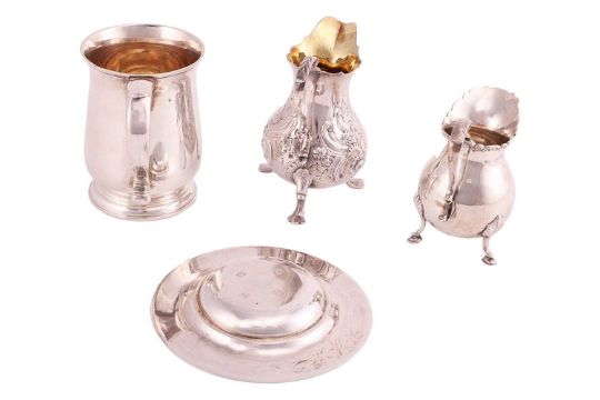 A silver baluster mug with engraved inscription, London 1924, a silver ashtray with chased flower decoration to the rim, London 1988, together with a George III silver baluster cream jug, later decorated with scrolling foliage and gilt interior, London 1761 and another baluster cream jug with cast leaf and flowerhead decorated rim, Birmingham 1907, 15.3ozt (4)