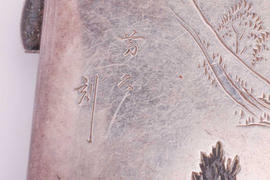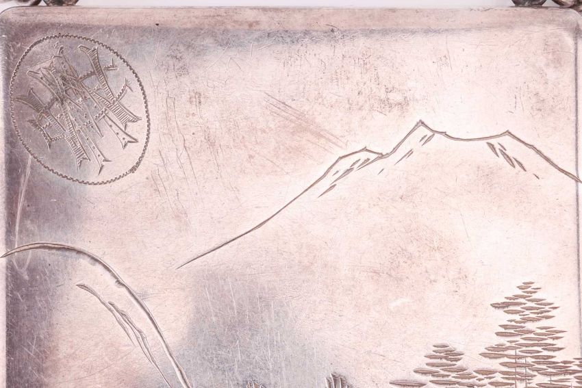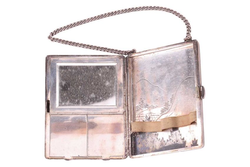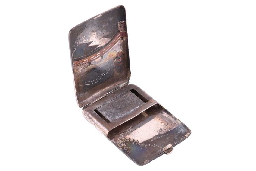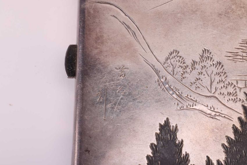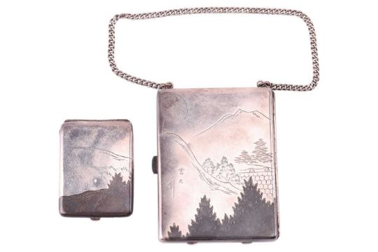 A Japanese combination cigarette and compact case, together with a matching vesta case; of rectangular form with rounded corners, engraved and decorated with scenic view of bridge and a pagoda, larger case suspended from a curb link chain and dated Aug 1930, stamped 'sterling', both signed 'Mitsuyoshi', total weight of items 6.13 ozt. (2)