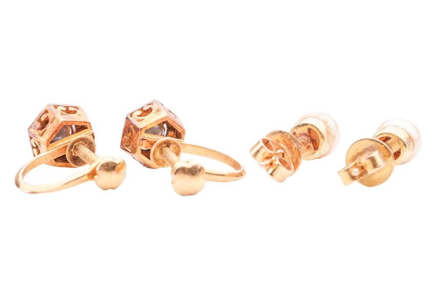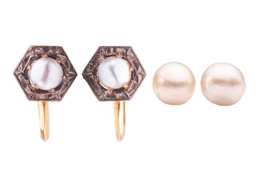 Two pairs of pearl earrings; to include a pair of stud earrings set with roundish cultured pearls of 6.0 mm, peg and butterfly fittings in metal marked '14K'; and another pair in hexagonal surrounds with scrolled gallery and screwed backs, metal testing as 18ct, overall measuring 7.8 mm across; Total weight of items 6.8 rams. (2)