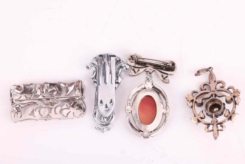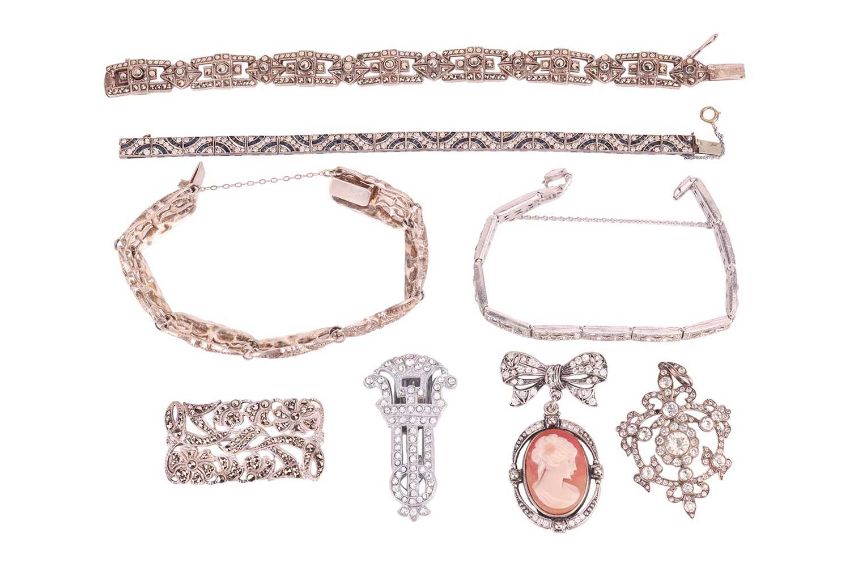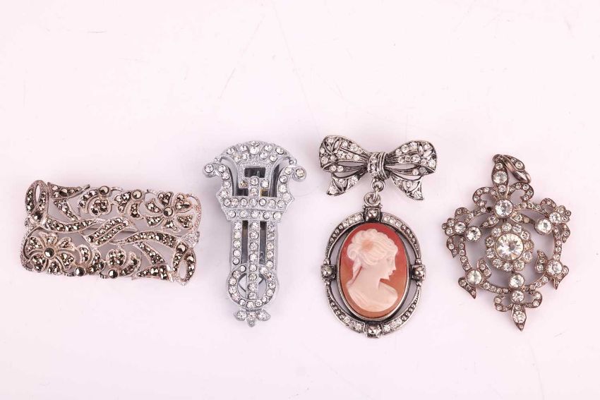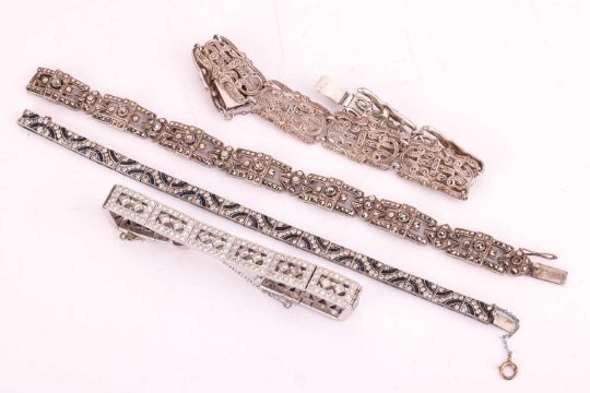 A collection of costume jewellery set with paste and marcasite, including four link bracelets, two brooches, a pendant and a late Art Deco-style shoe clip. (8)