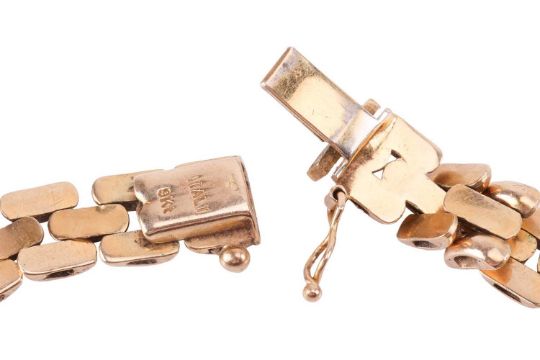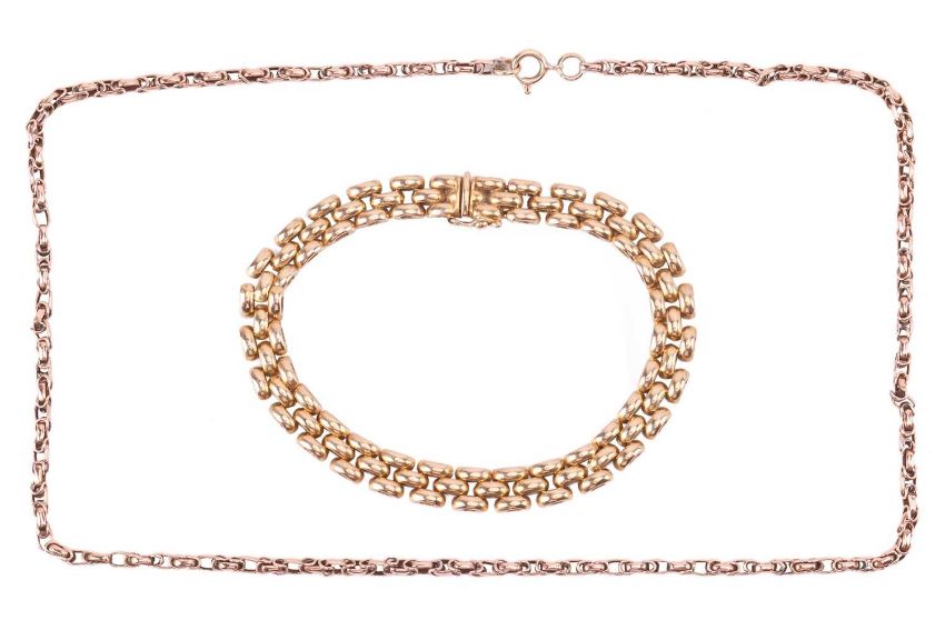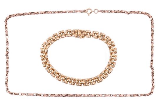 A panther link bracelet in 9ct yellow gold, tongue clasp fastening, 19.5 cm long; and a fancy link necklace with later-added spring-ring clasp, unmarked metal testing as 9ct, overall length 44.0 cm; Total weight of items 16.9 grams. (2)