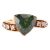 A green metamict zircon dress ring, centred with a trilliant-cut metamict zircon of 10.3 x 10.6 x 6.2 mm, bypass shoulders claw-set with circular-cut white sapphires, leading to a flat shank in yellow metal testing as 18ct, size N½, 5.4 grams.