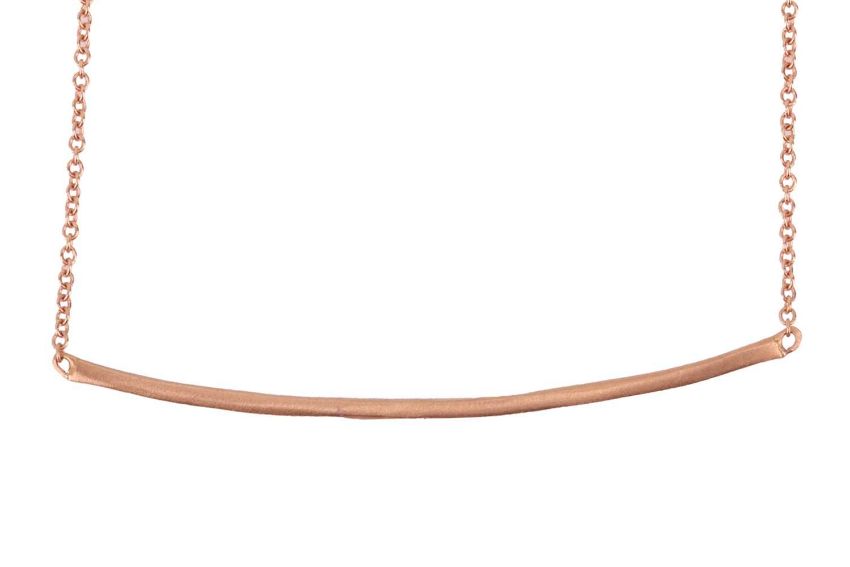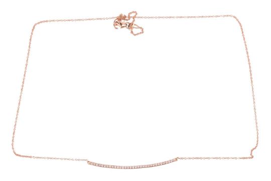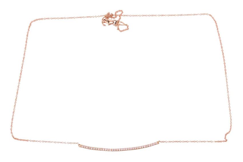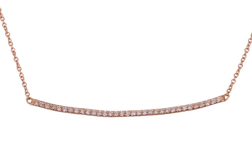 A diamond-set necklace, comprising a curved bar pavé-set with a row of diamond accents, with an estimated total weight of 0.16ct, to a fine cable link chain and finished with lobster clasp, pink metal marked '750', overall length 45.0 cm, 2.4 grams.