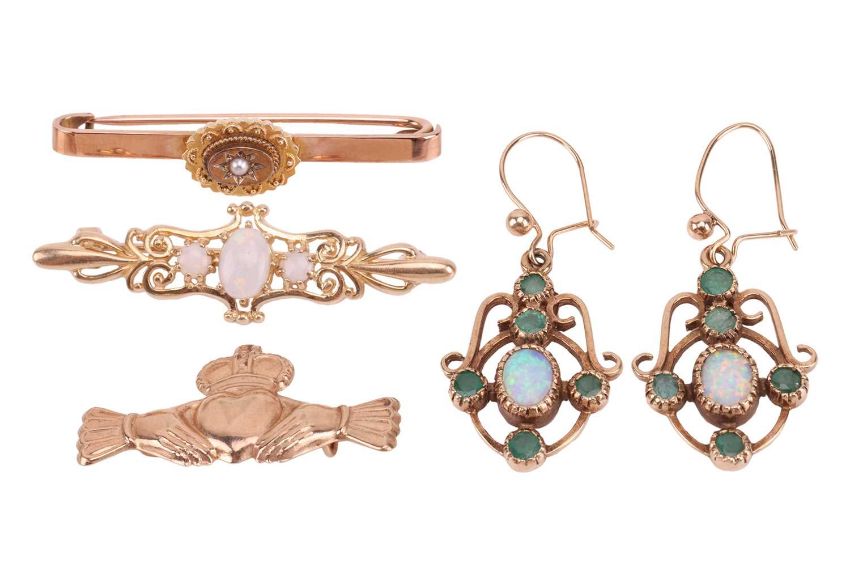 Three brooches and a pair of pendant earrings; including an Irish Claddagh brooch stamped from a pinkish metal sheet tests as 14ct; an Etruscan Revival design bar brooch metal marked '9ct'; an opal scrolled bar brooch in 9ct yellow gold; and a pair of earrings of scrolled design, centred with an oval opal and further embellished with emeralds, in yellow metal testing as 9ct, 3.5 cm drop; Total weight of items 10.1 grams. (4)