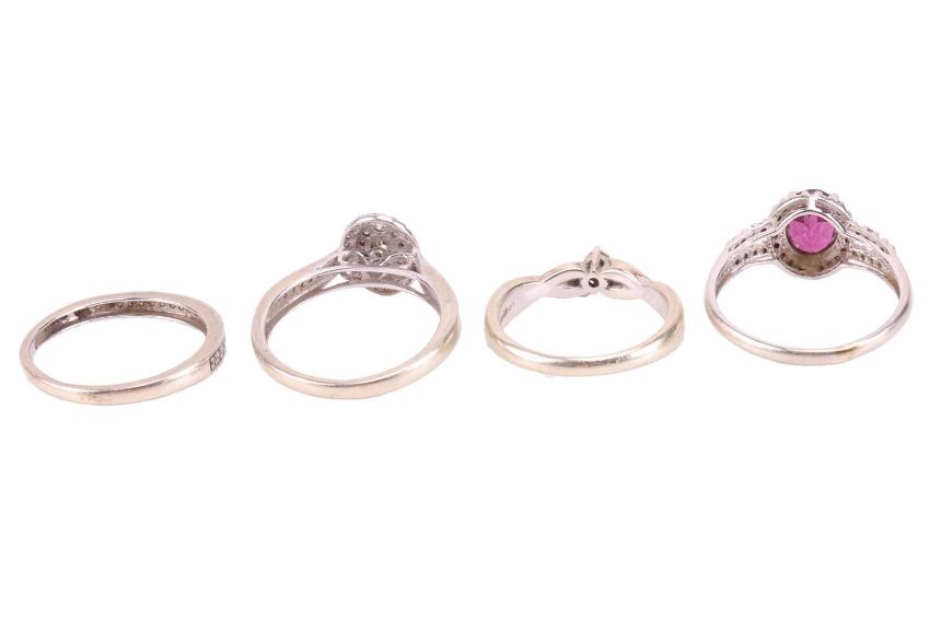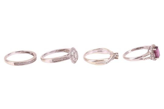 A collection of four dress rings in 9ct white gold; to include a rhodolite garnet and diamond halo ring in size O; an oval diamond cluster ring in size O½; a diamond half-eternity ring in size O½; a diamond ring with braided shoulders in size M; Total weight of items 9.8 grams. (4)