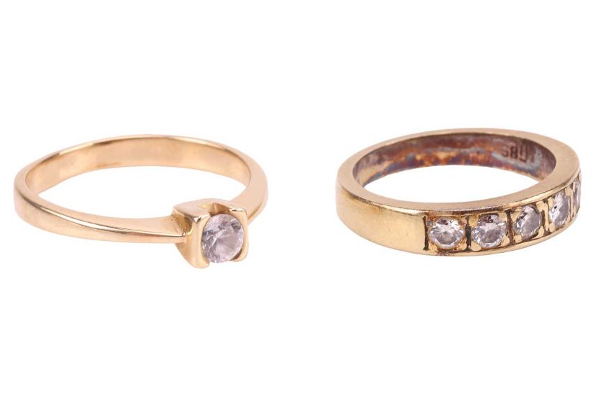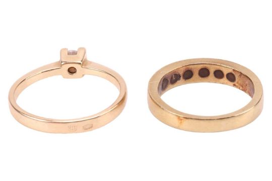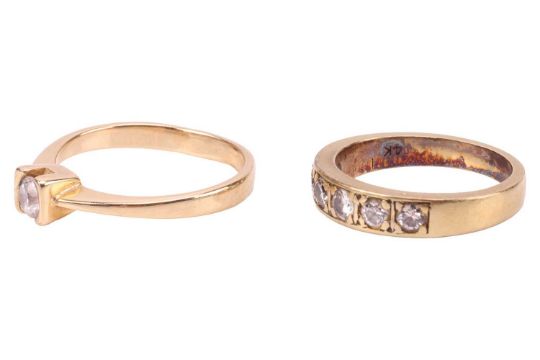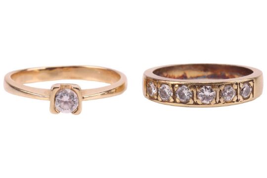 Two rings comprising a solitaire ring, featuring a CZ in a semi-bezel setting, to a yellow metal shank, tested as 14ct gold, together with a diamond-set half-hoop ring, with six round brilliant diamonds in a yellow metal mount marked '585'; Total weight of items 6.0 grams (2)