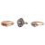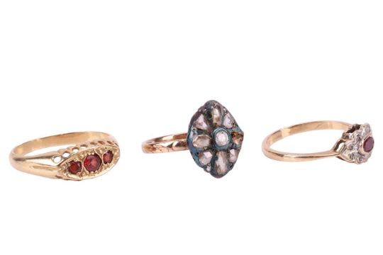 Three gem-set rings; to include a garnet three-stone ring in 9ct gold, size P; a glass-filled ruby and diamond ring in 9ct gold, size O; and lastly a cluster ring adapted from a clasp, the oval panel encrusted with foiled-back rose-cut diamonds, centred with a replacement CZ, to a later-added ring shank testing as 14ct, size L; Total weight of items 7.8 grams. (3)