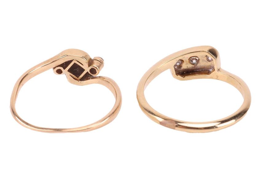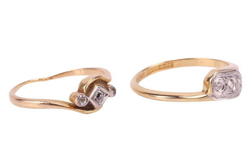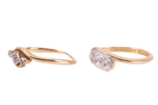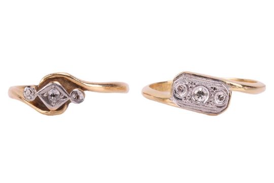 A diamond-set dress ring, the white metal plaque set in a crossover style and set with three single-cut diamonds, to a yellow metal shank tested as 18ct gold, size M; together with a diamond-set dress ring, with a yellow metal shank marked '18ct', size L; Total weight of items 4.1 grams (2)
