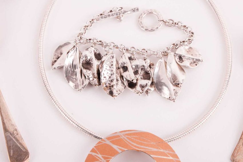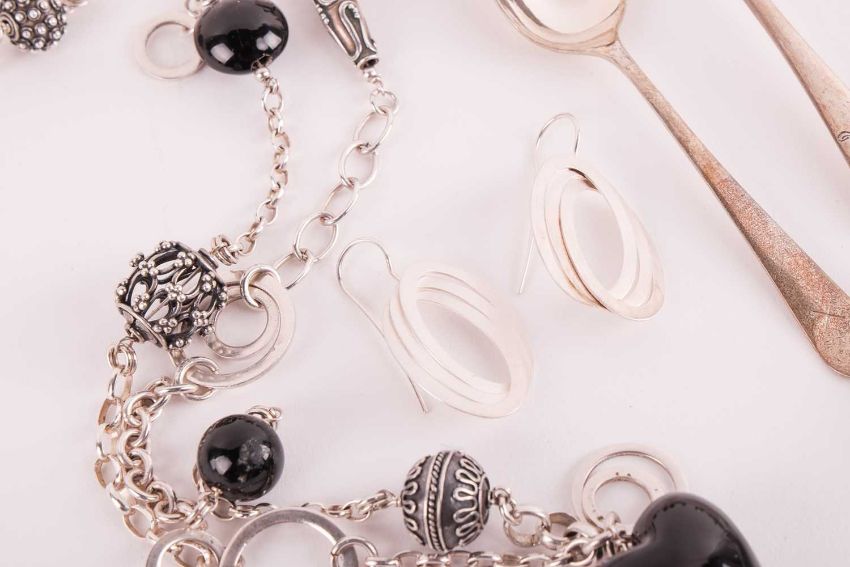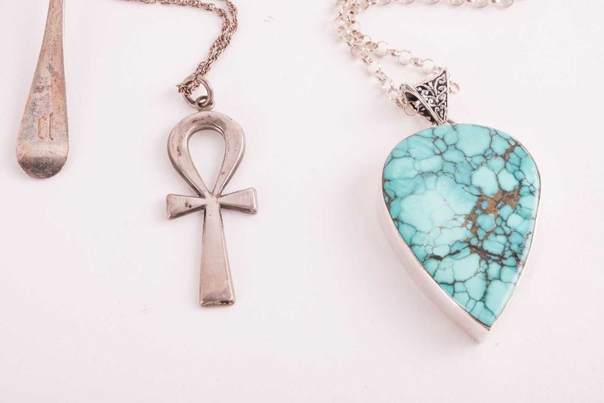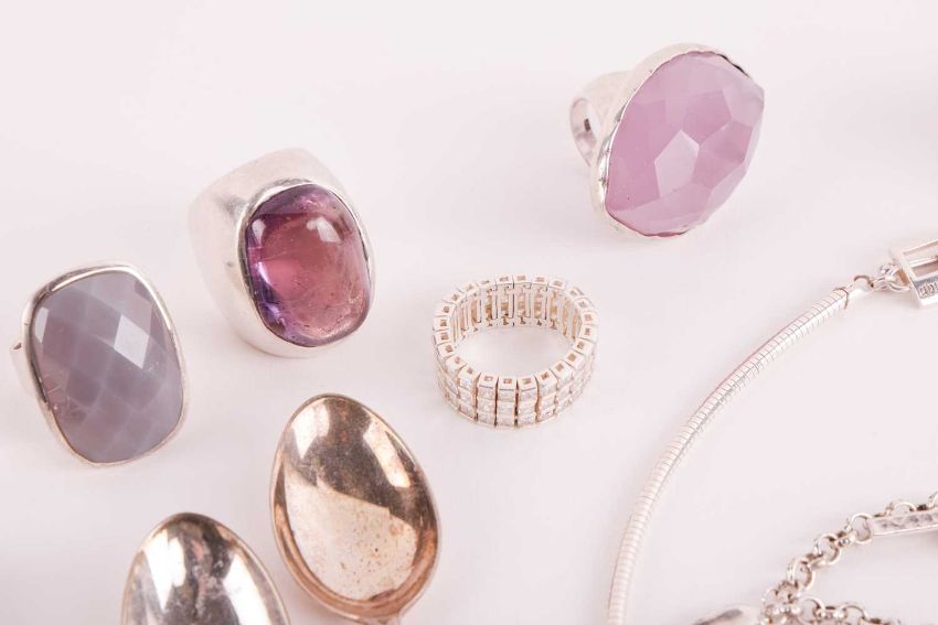 A small collection of jewellery items together with four silver teaspoons; including examples of a silver TEGO circular pendant by Teresa Gonzales, on a silver snake chain with a toggle clasp by Babette Wasserman; another link chain necklace with spherical spacers and onyx heart pendant with tassel; a few large gem-set cocktail rings in white metal stamped '925'; a George IV silver teaspoon London 1830, and three others; and a base metal open cuff bangle.