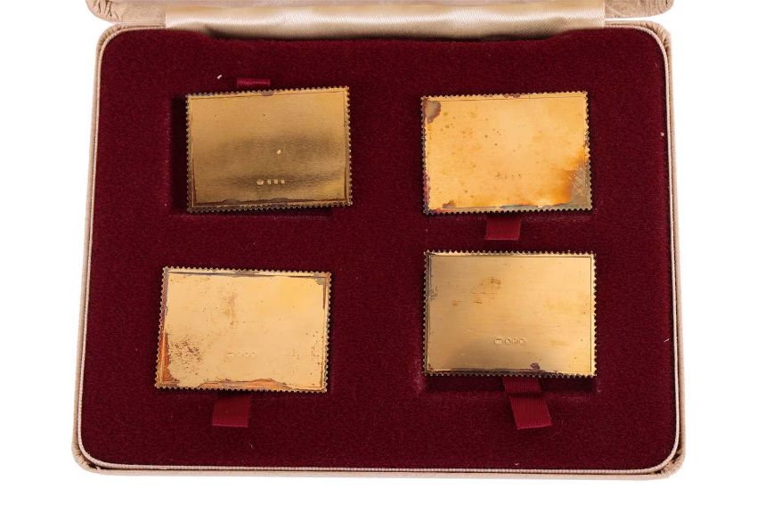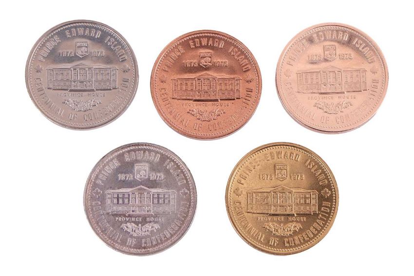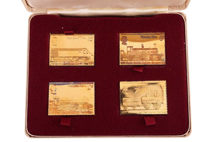 A cased Prince Edward Island 'Centennial of Confederation' (1873-1973) four-coin set, comprising a silver, bronze, cupro-nickel and gold coin (the latter tests as 14ct, weight 36.5g), together with a copper coin from the same edition, and a cased 1825-1975 Passenger Railway 150th Anniversary, limited edition silver gilt stamp set, with certificate numbered 4382/5000.