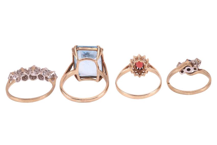 Four 9ct gold gem-set rings; to include a sapphire and diamond three-stone crossover ring, size K½; a garnet and CZ halo ring in size P; a CZ five-stone ring in size P; and lastly a scissors-cut blue paste ring in size M; Total weight of items 11.3 grams. (4)