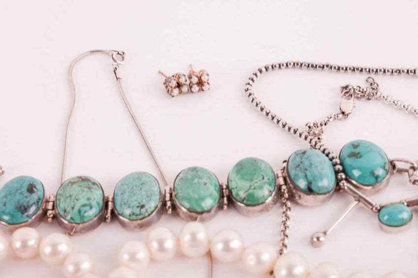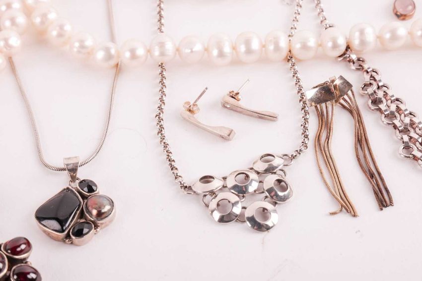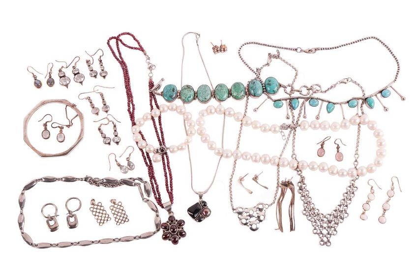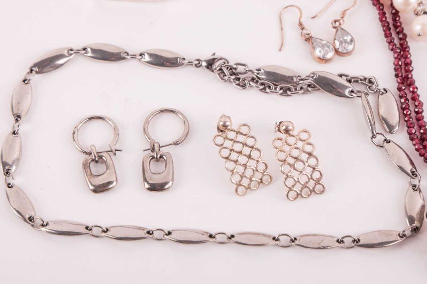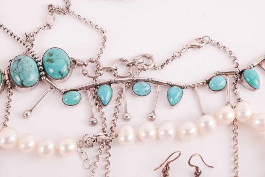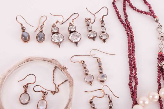 A mixed aggregate of jewellery items; to include examples of a fringe necklace set with turquoise cabochons in white metal stamped '925', a hinged link bracelet set with oval turquoise cabochons in white metal stamped '925', a floral cluster pendant set with oval garnet cabochons on a double garnet beaded necklace, a pair of earrings set with moonstones, a similar set with rose quartz, two strands of potato cultured pearls, and other items such as earrings and bracelets.