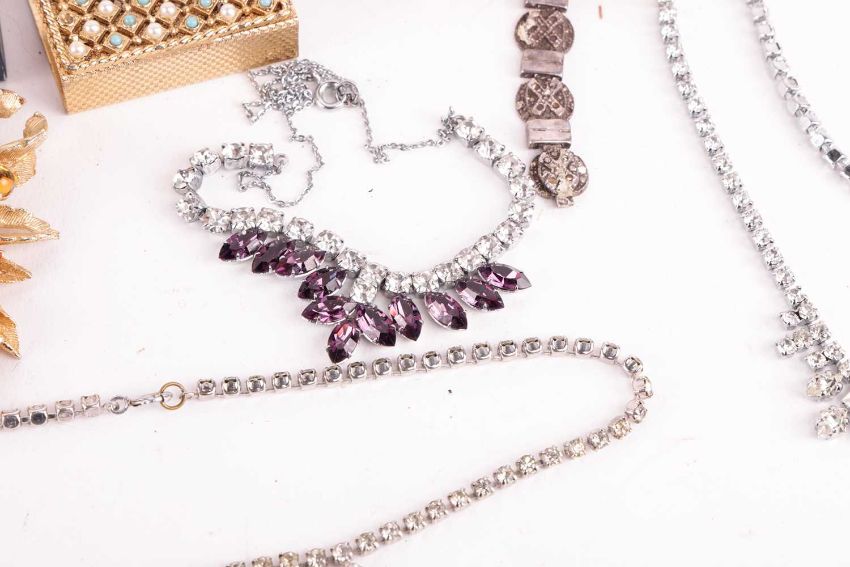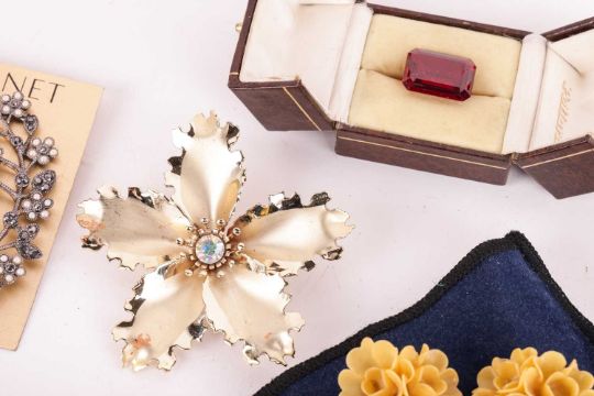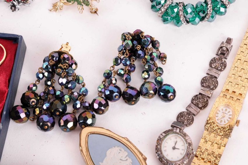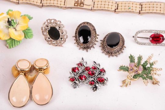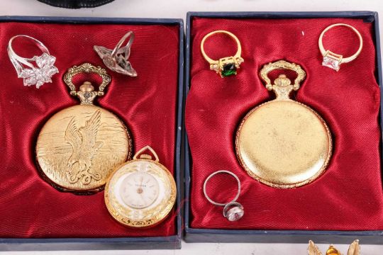 A group lot of costume jewellery, to include antique paste set brooches, a Monet brooch, marquasite set ring, various clip earrings, pill boxes, a hardstone set match box and various buttons, pins, paste set bracelets and a Givenchy bracelet. Also a crocodile cigarette case and red gem, pocket watches and various items.