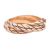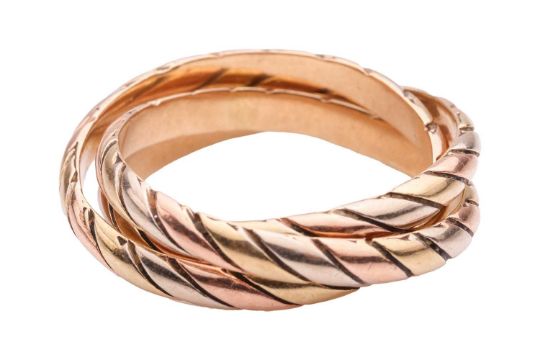 A tri-colour trilogy band, featuring three interlocking court-shaped bands with a ridged design, tested as 14ct gold, size I1/2; 4.6 grams