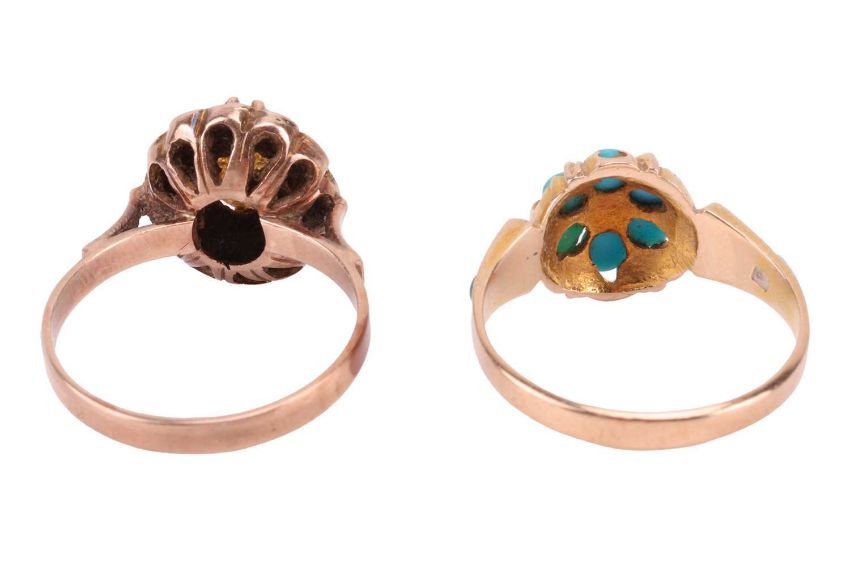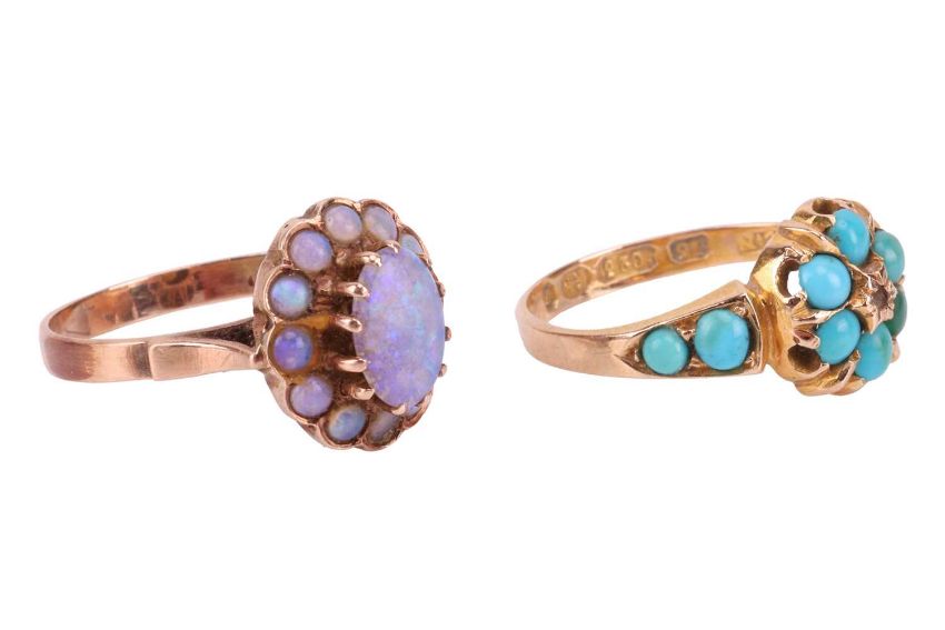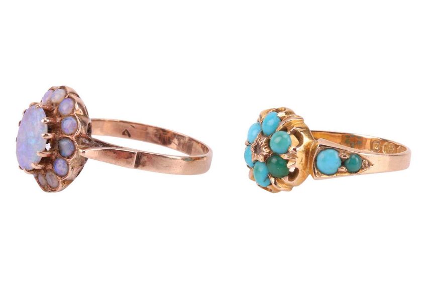 Two gem-set cluster rings; the first is a daisy head cluster ring set with round turquoise cabochons, mounted to 15ct yellow gold, Birmingham 1924, size M½; together with an opal cluster ring, displaying play-of-colour mostly range from green to purple, to unmarked metal testing as 14ct, size M; Total weight of items 4.9 grams. (2)