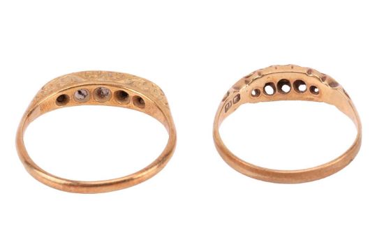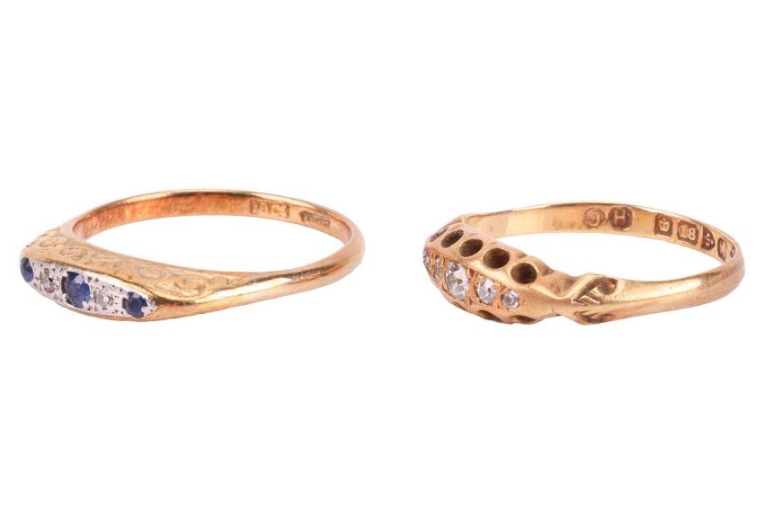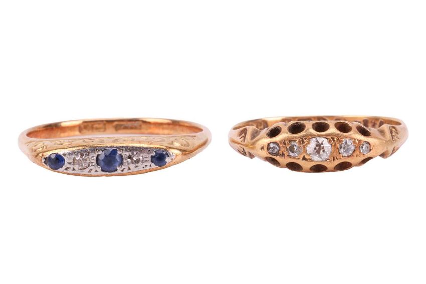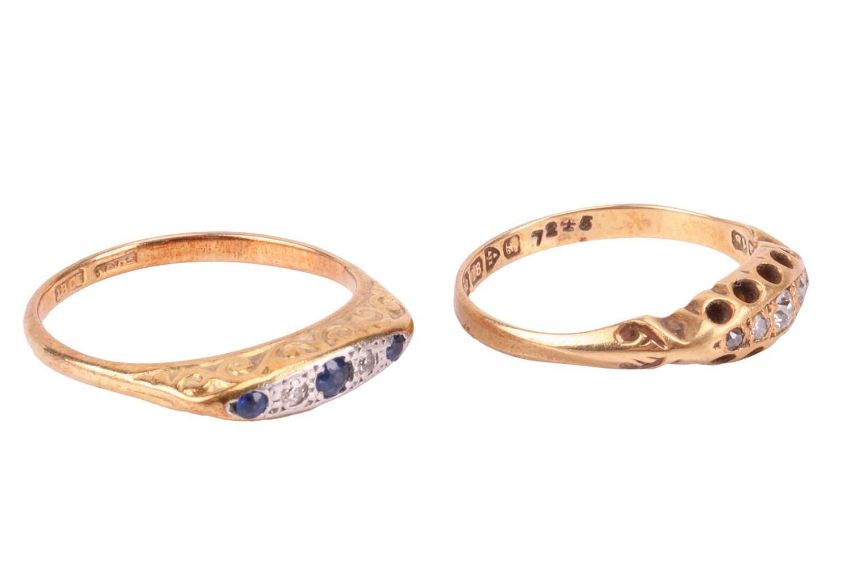 Two rings; comprising an Edwardian diamond-set half-hoop ring, featuring five graduated old-cut diamonds, in an 18ct yellow gold mount, Chester, 1906, size N1/2; together with a sapphire and diamond half-hoop ring, in yellow metal marked '18ct', size P; 4.3 grams (2)
