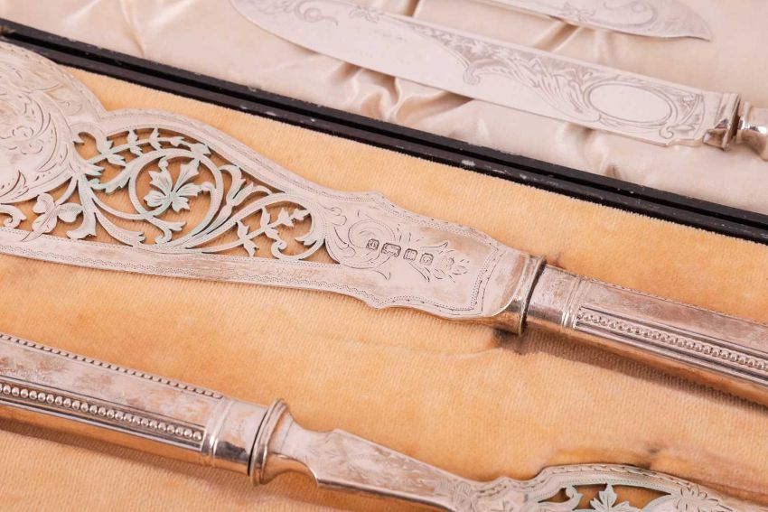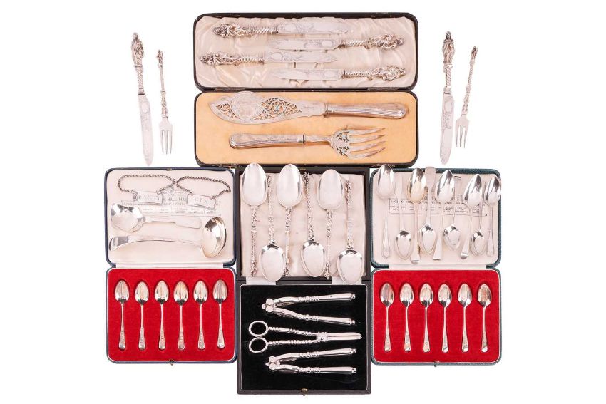 A pair of Victorian silver fish servers by Martin, Hall & Co (Richard Martin & Ebenezer Hall) in a Walker and Hall fitted box, a pair of silver decanter labels, two boxed sets of British Hall Marks silver spoons, eight sundry silver spoons, a set of six silver plated knives, six silver plated apostle spoons, two silver plated apostle forks, two silver plated teaspoons and a silver plated sauce ladle.