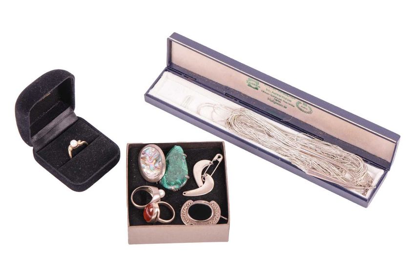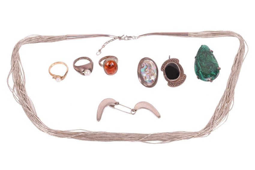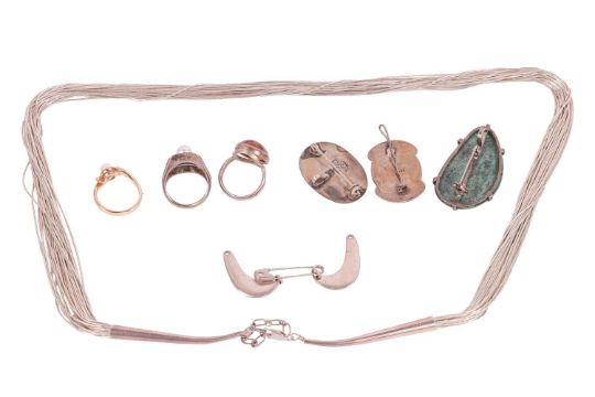 A small quantity of jewellery items comprising a 9ct yellow gold pearl solitaire ring, size N, a multi-strand bar-link necklace, marked '925', an amber cabochon ring, a pearl-set ring, in white metal marked 'sterling silver', three gem-set brooches including a mother-of-pearl brooch stamped 'Mexico' and other items; 78.3 grams (8)