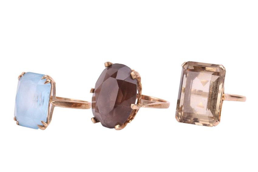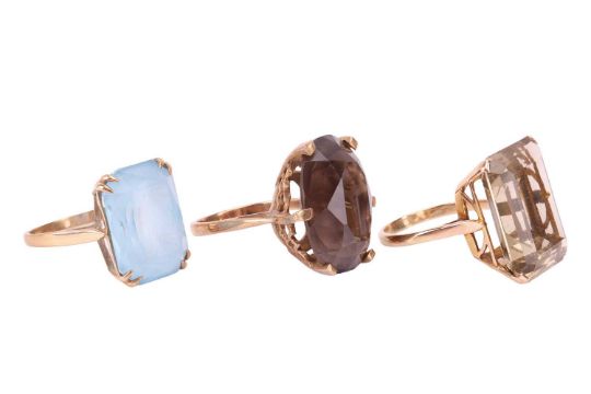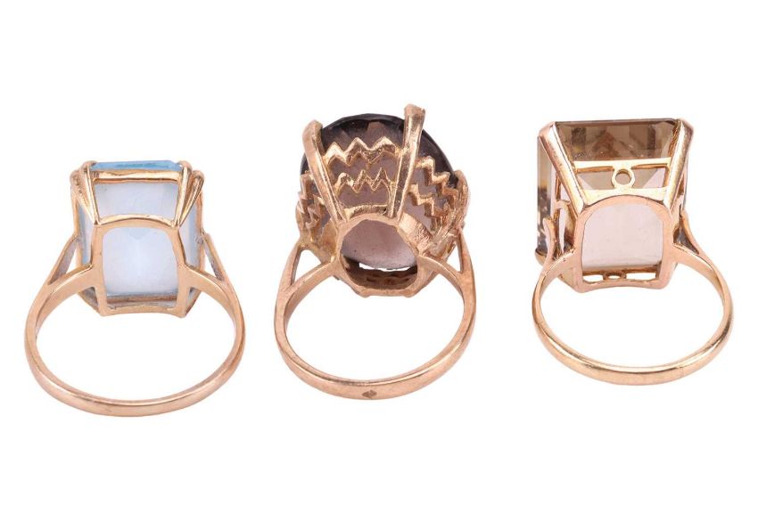 Three large gem-set rings; to include a scissors-cut pale blue paste ring in 9ct gold, size R; an octagonal-cut smoky quartz ring in 9ct gold, size N½; and an oval-cut smoky quartz ring in metal stamped '9ct', size N½; Total weight of items 20.0 grams. (3)