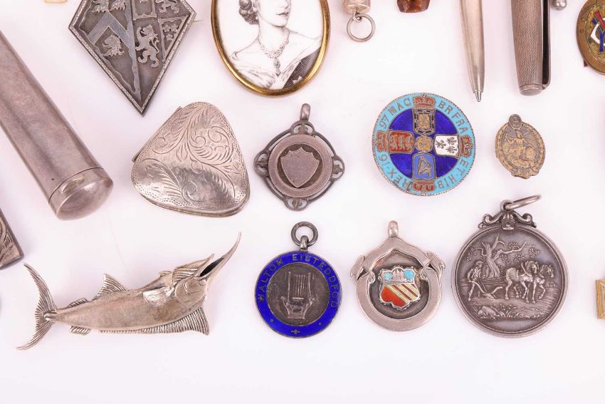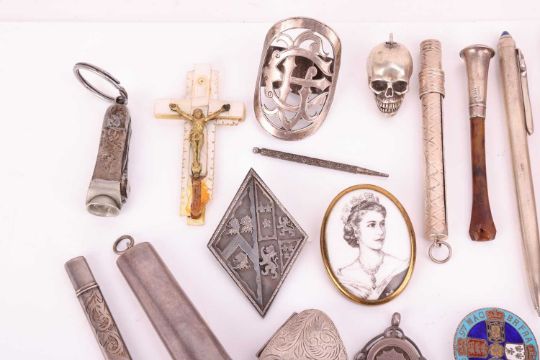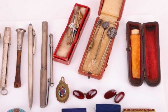 A mixed collection of silver items and other jewellery items; to include a pressed amber cigarette holder; two pressed amber cheroot holders, one in a fitted silver case with suspension loop, the other in a fitted leather box; a mechanic pencil with silver barrel and a lapis lazuli cap; together with a family crest brooch, utility pen knife, cufflinks, stickpins and medals etc.