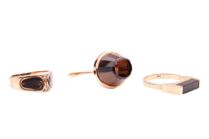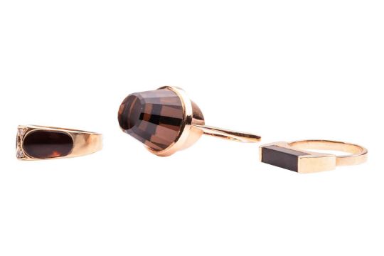 Three rings; comprising a smoky quartz cocktail ring, the tapered gemstone bezel-set in a yellow metal mount with an angular shank, tested as 18ct gold, size P1/2, together with an onyx-set ring, marked '14K', size O, and an angular dress ring, set to the centre with diamonds and imitation tortoiseshell plastic inserts, in a yellow metal mount marked '585', size O; 21.4 grams (3)