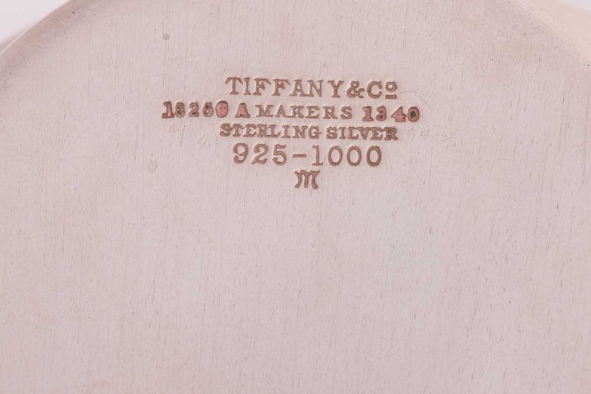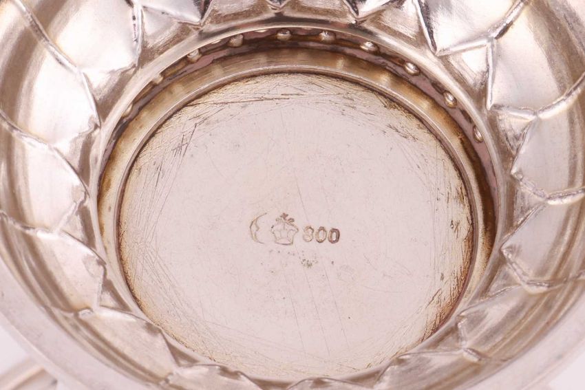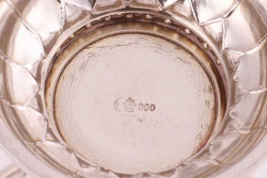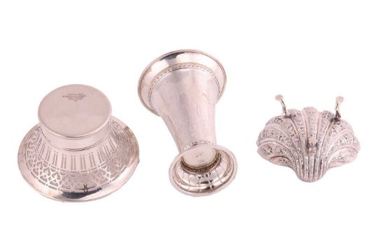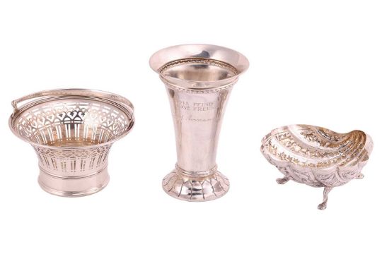 An Indian white metal shell-shaped dish, profusely decorated with animals, trees and dwellings, on three paw feet, together with a Tiffany "Sterling" basket with pierced border and swing handle, numbered 18269A Makers 1340, 4ozt, and a German white metal trumpet vase inscribed "1918 Feind, 1932 Freund", German hallmarks 800 standard, 4.1ozt. (3).