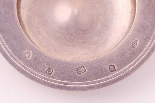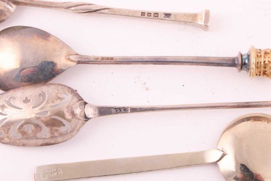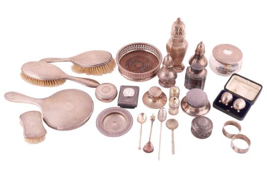 A mid 18th Century silver mote spoon, possibly by Phillip Roker; a silver sugar caster Birmingham 1973, an Armada dish, a pair of silver napkin rings, a small capstan inkwell, and a number of other items of silver and white metal; together with a small quantity of silver plate. Gross weighable 14ozt