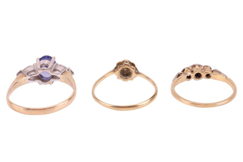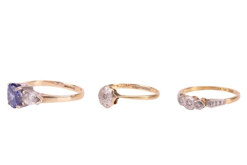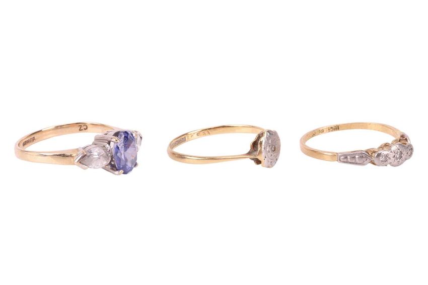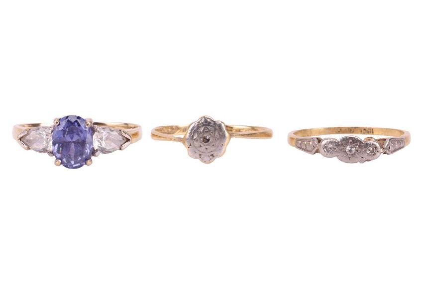 Two Edwardian diamond rings and another; both diamond rings are in illusion settings, in metal marked '18ct & plat', size O½ and N respectively; and another ring in 9ct, set with an oval-cut purple CZ between two colourless pear-cut CZs, size O; Total weight of items 6.5 grams. (3)