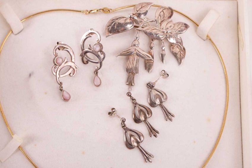 A collection of Ola Gorie jewellery and other items; including a foliate pendant on chain and earrings set in 9ct yellow gold, cased; another set of knot design comprising a pendant on chain and a pair of drop earrings with keshi pearls, signed 'OMG', cased; a silver circular brooch and a pair of drop earrings signed 'OMG'; a silver foliate brooch, a 9ct yellow gold brooch, a diamond-set bar brooch in 18ct gold; and a 9ct gold heart pendant on chain.