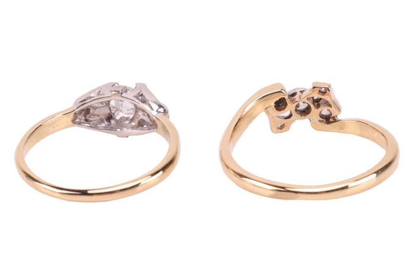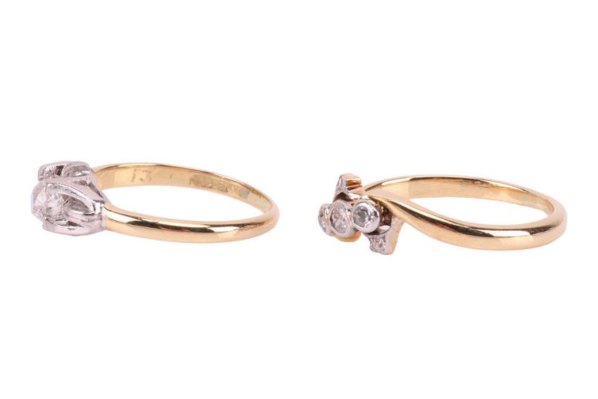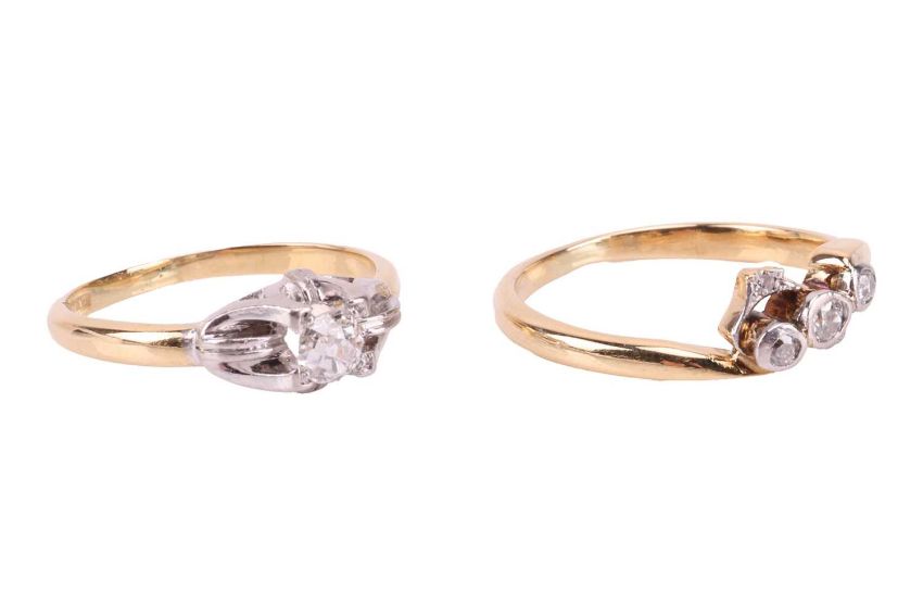 An early 20th-century diamond ring, featuring an old-cut diamond, claw-set in a white metal grooved setting, to a yellow metal shank marked '18ct' and 'Plat', size J1/2; together with an old-cut diamond crossover ring, in yellow metal tested as 18ct gold, size M; Total weight of items 5.2 grams (2)