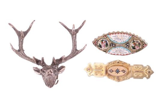 A full hoop diamond eternity ring, set with a band of Princess cut diamonds, in engraved mounts which tests platinum; a three stone diamond ring in 18 carat gold mount; a half hoop diamond eternity ring set in 18 carat gold; a half hoop sapphire and diamond ring; together with a Victorian sapphire and pearl bar brooch; a micromosaic brooch and a stag's head brooch. Gross weight weighable 9 grams.