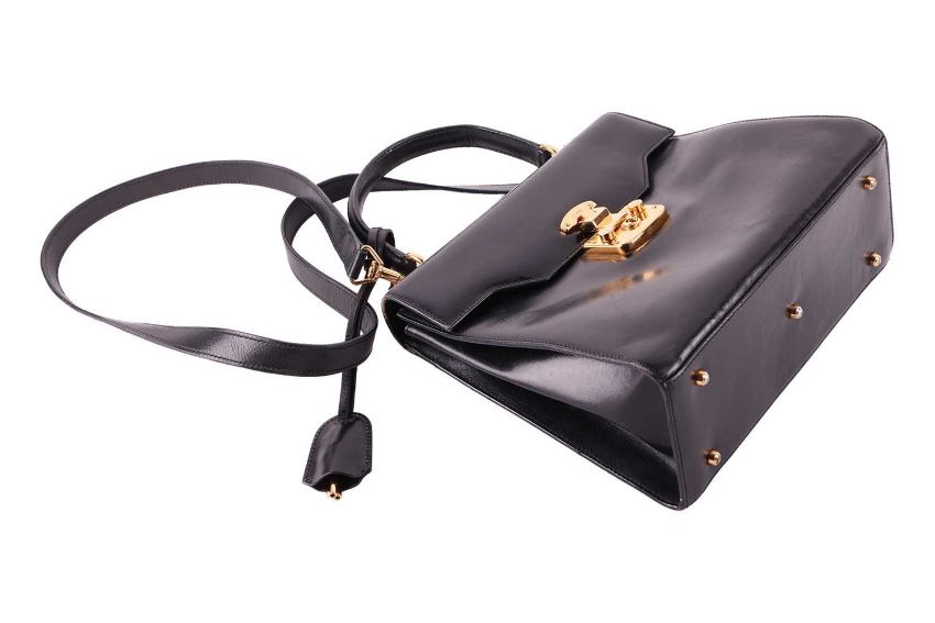 A Gucci black leather handbag, of plain tapering rectangular form and red leather interior, with a top handle as well as a detachable shoulder trap, in dust bag.
