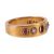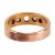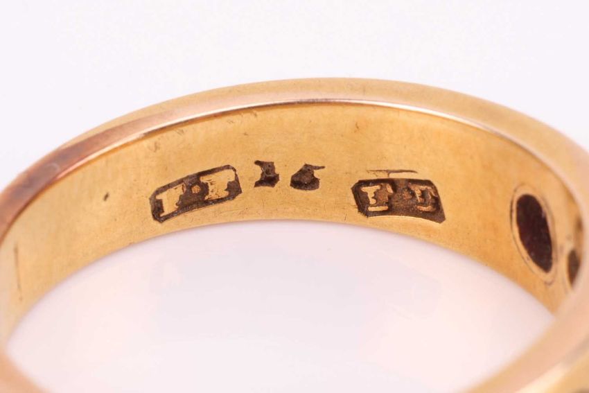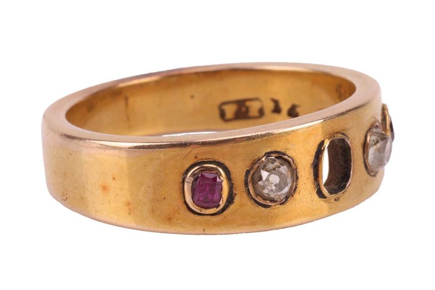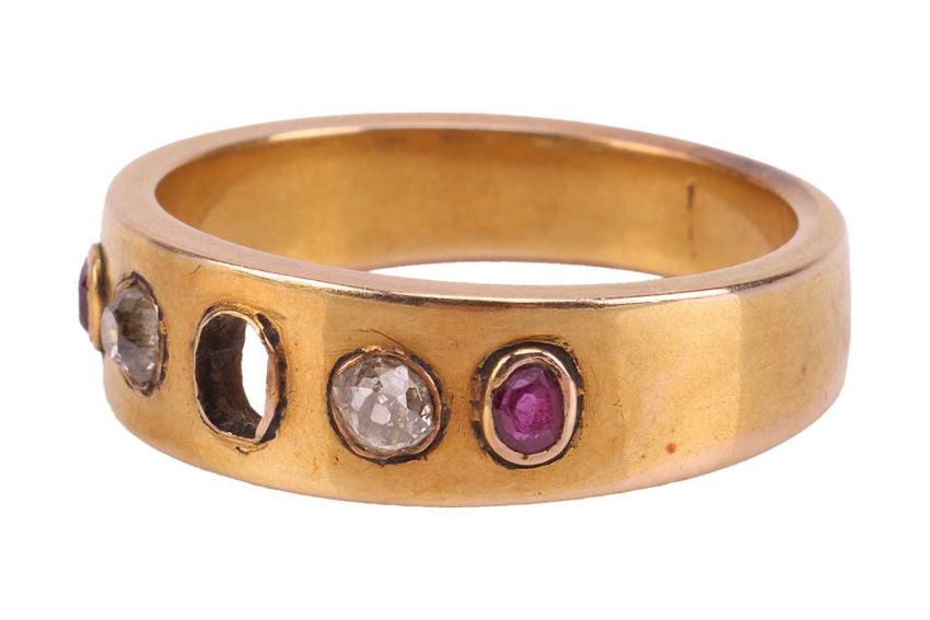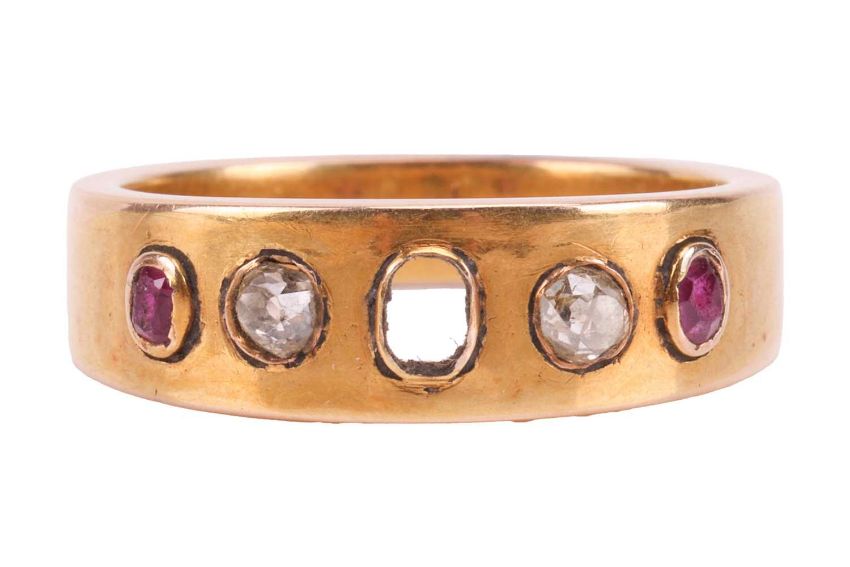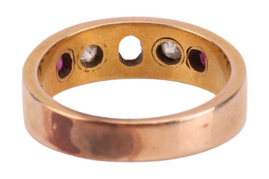 A ruby and diamond-set ring, featuring two oval rubies and two old-cut diamonds, with the central stone missing, bezel-set in a yellow metal flat band, tested as 14ct gold, size Q1/2; 6.8 grams