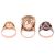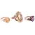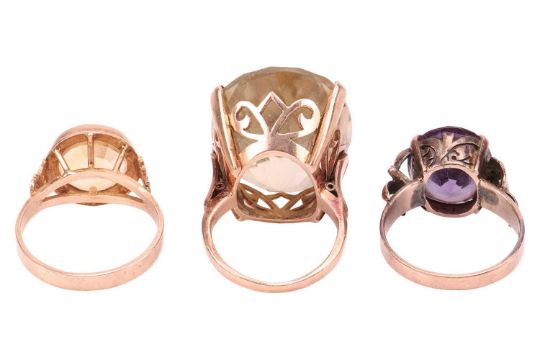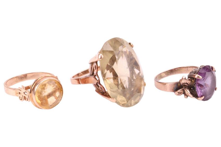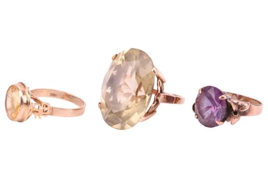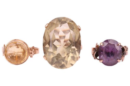 Three gem-set rings; to include a large citrine dress ring in a pierced scrollwork gallery, oval-cut citrine measures 26.0 x 18.4 mm, mounted in yellow metal testing as 18ct, size I; another similar set with a circular-cut citrine of 11.2 mm, collet-set between pierced shoulders with the Chinese character 'Fu' for prosperity, in metal marked '375', size N; and a synthetic colour-changing sapphire ring between foliate shoulders, to shank testing as 9ct, size M; Total weight of items 20.0 grams. (3)