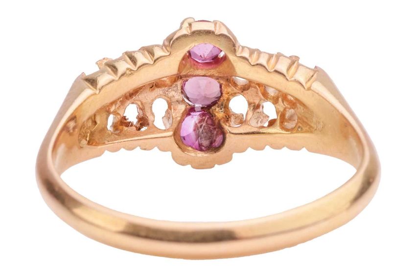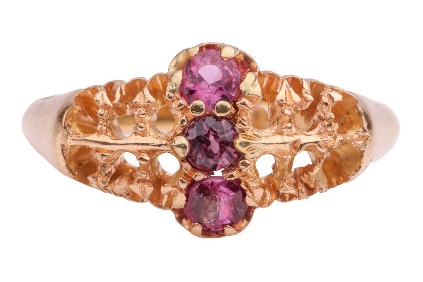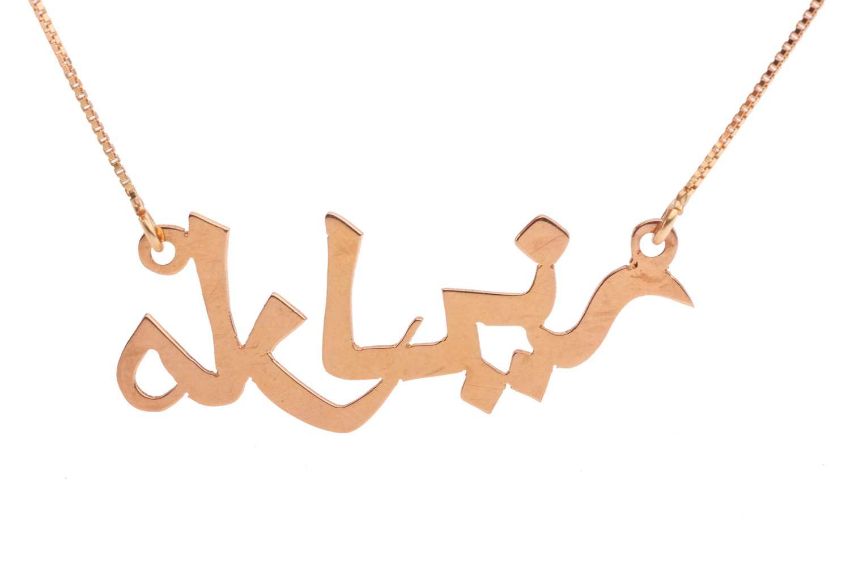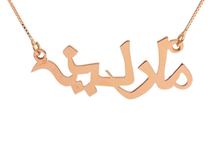 A name necklace and an 18ct gold ring mount; a pierced name Marilyn in Arabic pendant, attached with two fine box link chains with spring-ring clasp, Italian marks '750', overall length 43.0 cm; a ring mount set with three circular-cut rubies and rest of the settings vacant, British assay marks for 18ct gold, size M½; Total weight of items 7.5 grams. (2)