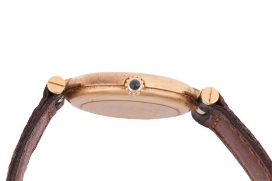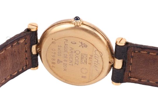 A Must de Cartier ladies quartz wristwatch, with a black enamel face in a gilt case, marked '925', to a black leather strap, in an unbranded black velvet case; 86.8 grams