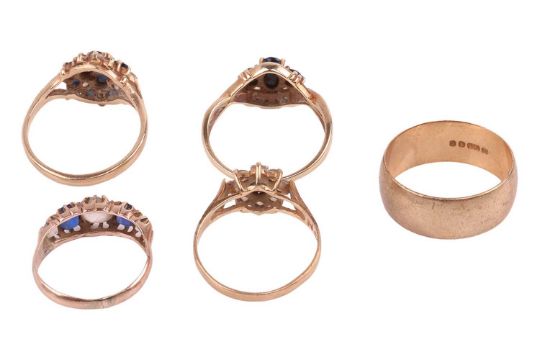 Four gem set rings, a 9ct gold band and a 9ct gold St Christopher pendant; The first a gem set cluster ring, set with cubic zirconia and sapphires with possible replacements, two stones deficient, claw set in yellow metal testing as 10ct, size P; A sapphire and diamond trilogy ring of crossover design, set in yellow metal with convention marks for 9ct, size Q, A sapphire and cubic zirconia cluster ring of foliate design, with engraved shoulders, claw-set in yellow metal with convention marks for 9ct, size N ½; A five stone gem-set ring, three white sapphires interspersed with two blue pastes, claw-set in yellow metal, the setting testing as 10ct and the shank testing as silver, hallmarks rubbed, two solder lines on shoulder of ring indicating repair, size K; A 9ct gold band, 0.8cm wide, UK Hallmarks, London, 1981, size Q; A 9ct gold pendant of St Christopher, 2.8cm diameter, UK Hallmarks, Birmingham, 1968; Total weight 20.4g (6).