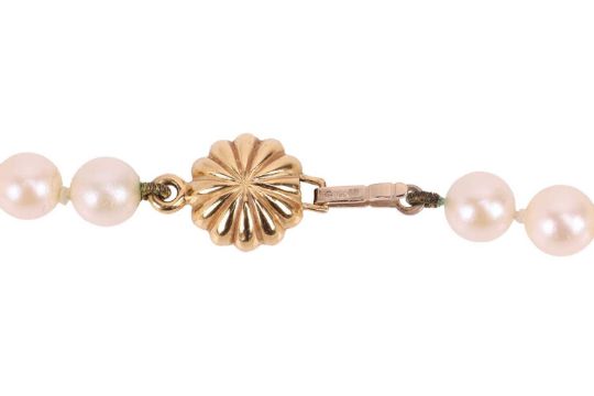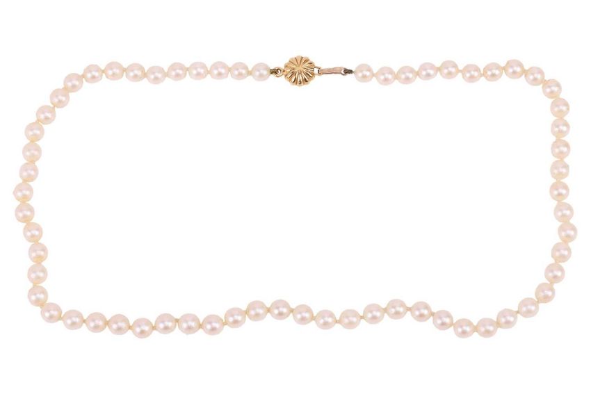 A cultured pearl necklace, the pearls of cream body and silver overtones, measuring approximately 6.1mm each, to a yellow metal clasp of floral design, marked '750', the necklace measuring approximately 44cm; 22.5 grams