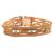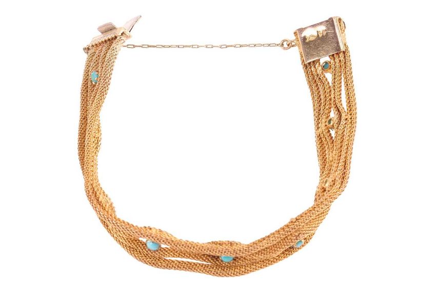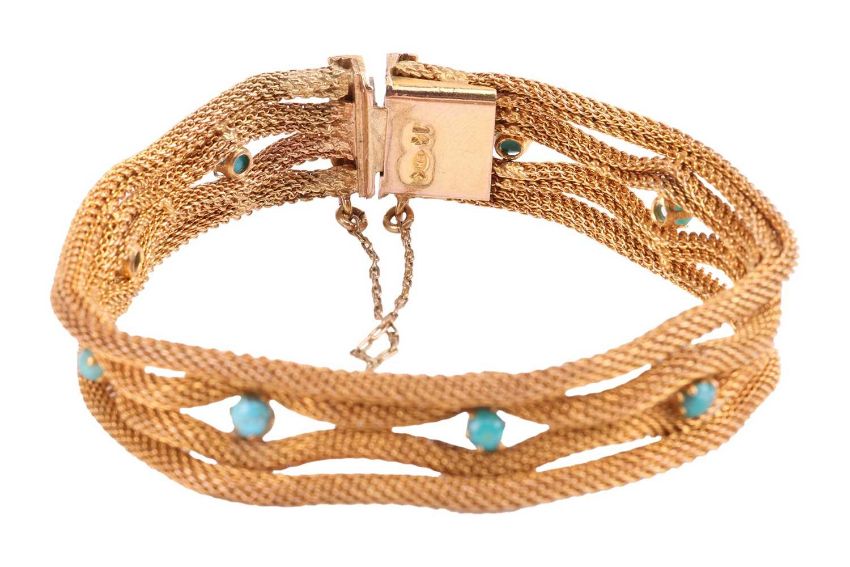 A turquoise-set mesh-style bracelet, featuring four mesh rows, partially connected and interspaced with nine round turquoise cabochons, leading to a push bar clasp and safety chain, in yellow metal marked '14', the inner diameter measuring approximately 55mm; 22.4 grams