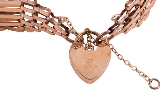 A 9ct gold gate bracelet, with cinched details and completed with a heart-shaped padlock clasp, struck with British assay marks; 13.8 grams