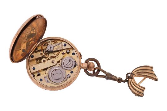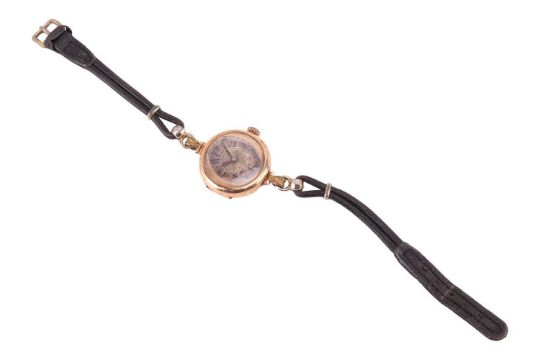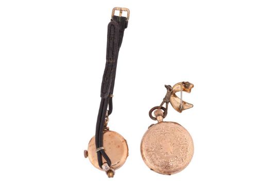 An open-faced pocket watch, marked '14K', having foliate and scrolling engraved detailing to the exterior, the dial having Roman numerals, with a wound movement, case width 33mm, together with a ladies manual wind wristwatch, with a yellow metal case marked '14K', to a black leather strap; 46.7 grams (2)