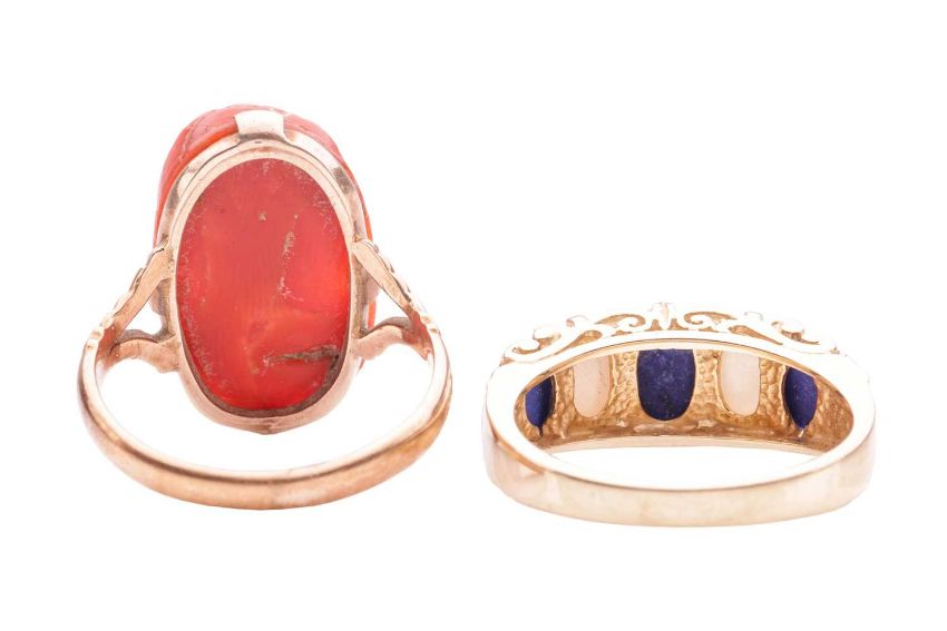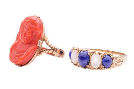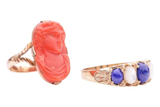 A corallium rubrum cameo ring and a lapis lazuli and moonstone five-stone ring