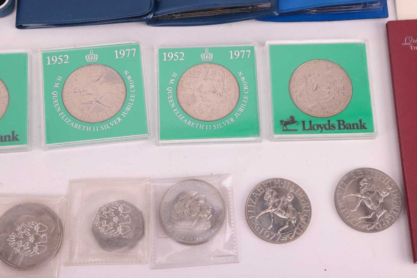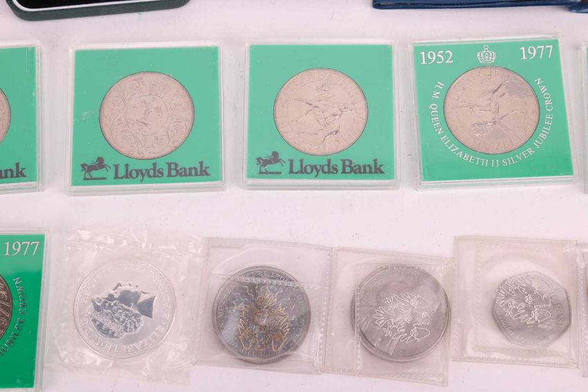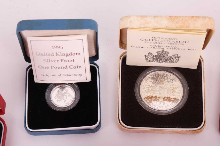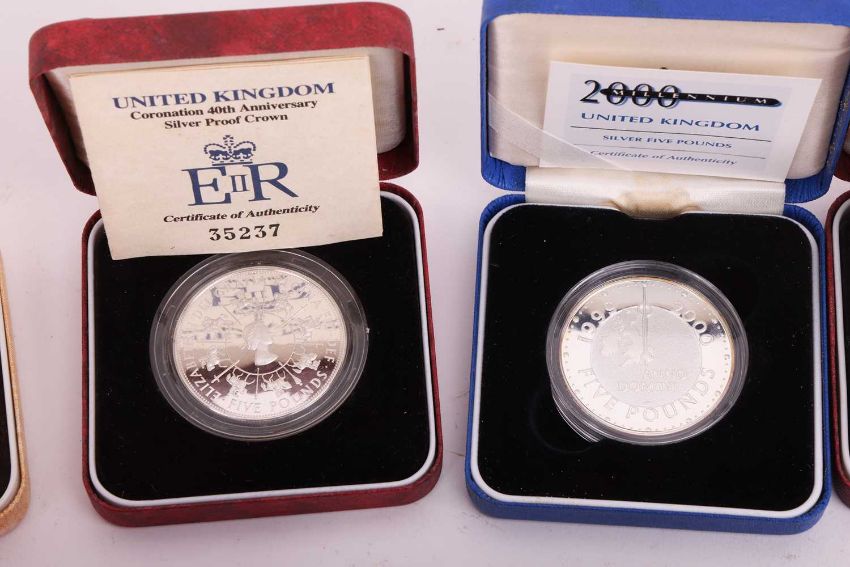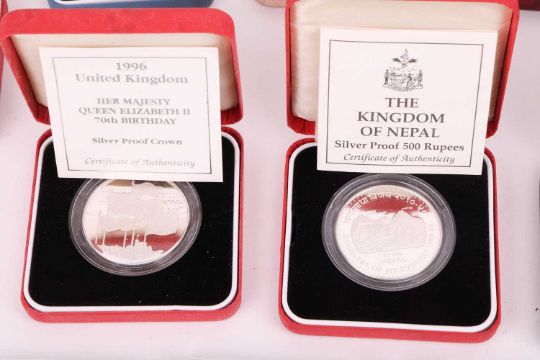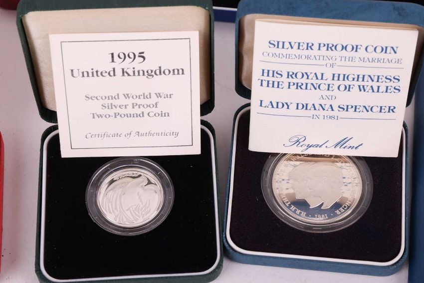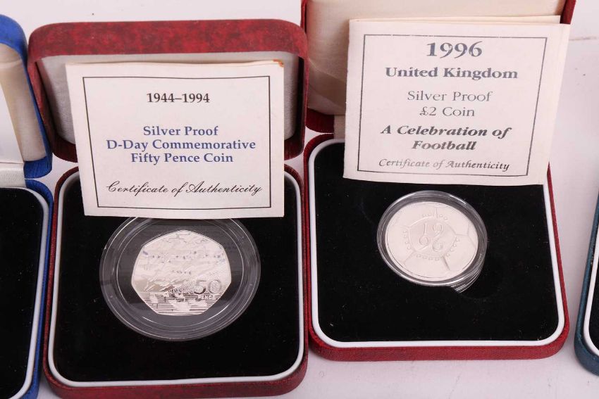 A collection of twelve cased silver proof coins, with certificates, comprising: 1996 £2 Celebration of Football, D-Day Commemorative Fifty Pence, 2000 UK Silver Five Pounds, QEII Coronation 40th Anniversary Crown, 1999 Alderney Total Solar Eclipse £2, 1995 Royasl Mint One Pound Coin, Queen Mother 80th Birthday Commemorative Crown, 1981 Royal Wedding Commemorative Coin, 1996 QEII 70th Birthday Crown, 1995 UK WWII Two-Pound Coin, Kingdom of Nepal 500 Rupees and Queen Mother 90th Birthday Crown, together with assorted further cupro-nickel and other commemorative coins.
